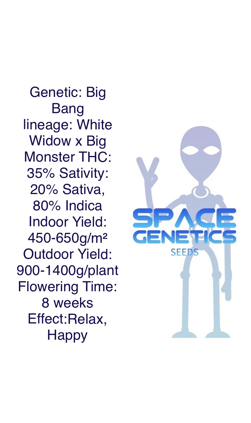Genetic: Big Bang lineage: White Widow x Big Monster THC: 35% ySativity: 20% Sativa, 80% Indica Indoor Yield: 450-650g/m² Outdoor Yield: 900-1400g/plant Flowering Time: 8 weeks Effect: Happy,Relax