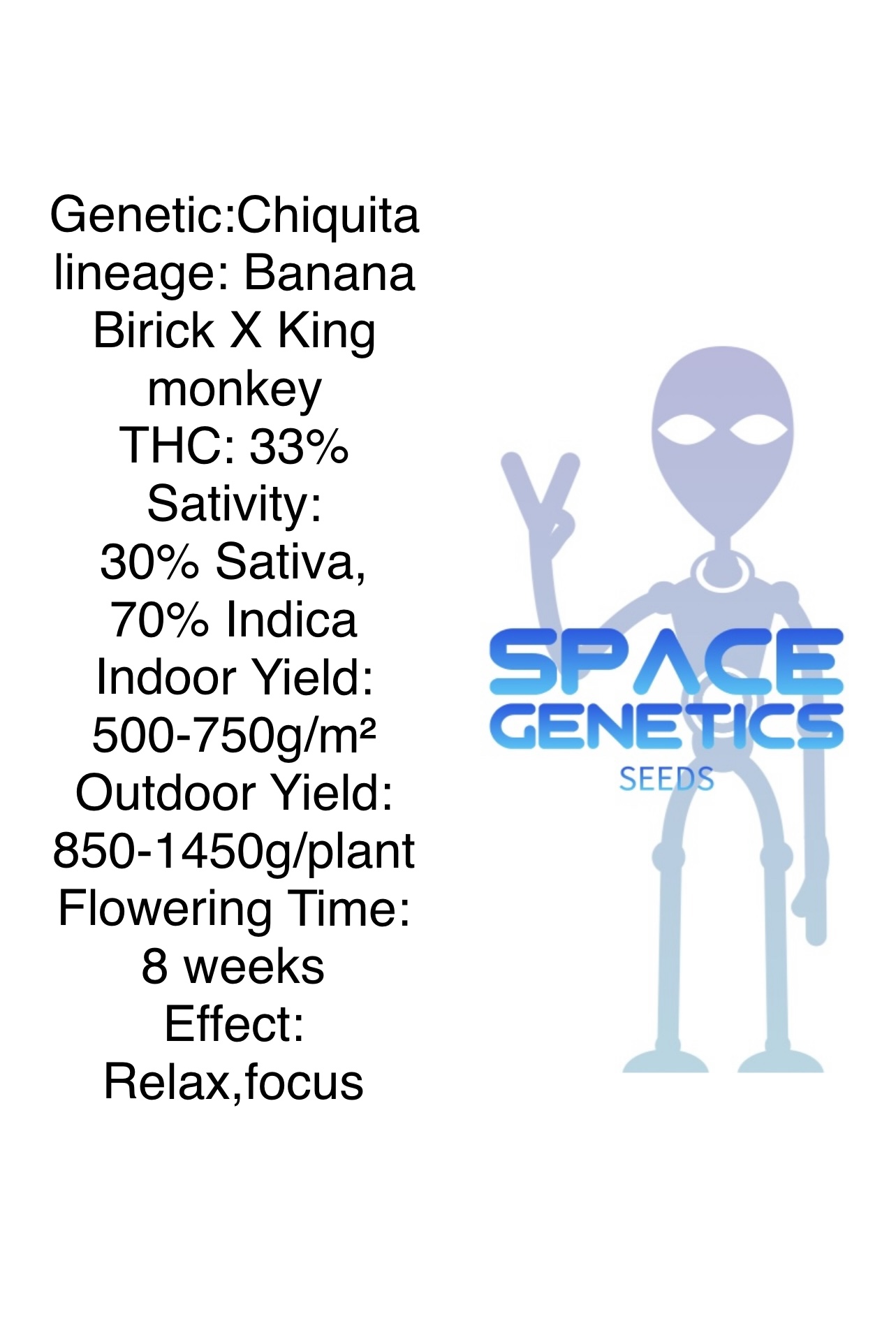 Genetic: Chiquita lineage: Banana Birick X King monkey THC: 30% Sativity: 30% Sativa, 70% Indica Indoor Yield: 500-750g/m² Outdoor Yield: 850-1450g/plant Flowering Time: 8 weeks Effect: Relax,focus